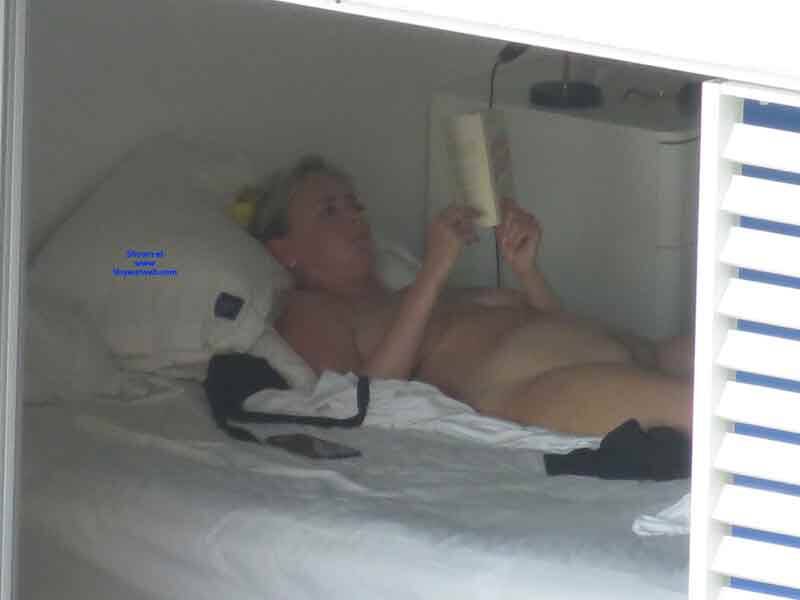 i saw this mature neighbor again she was lying on her bed reading a book topless i took my shitty camera and zoom on max she start streching her legs while reading and few minutes later i came back and she was completly naked this time reading the same book.