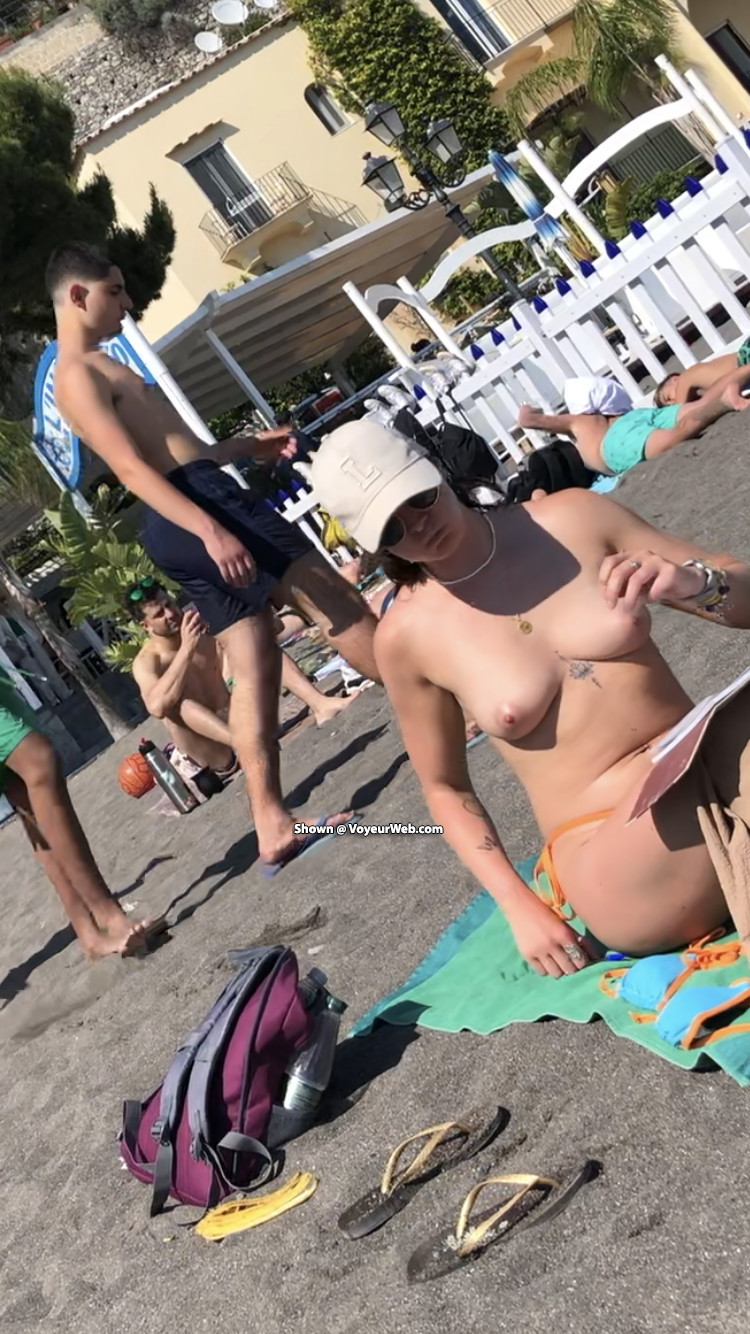 I was on the beach in Positano, Italy yesterday - it’s really strict no topless bathing anywhere on the Amalfi coast but this sexy young Italian woman sat there proudly topless all day.  She had tiny bikini bottoms that showed her pussy lips clearly too - she was loving all the attention from men, and there was a lot as no one else was topless. Sadly I used my phone battery up taking these - when she was leaving she stood up, wrapped her towel around her waist but left if fairly open at the front. As she pulled down the bikini her smooth shaven pussy with big meaty lips was there just in front of me…..she didn’t rush to put on her mini skirt, no panties of course. Wish I could have captured that too….