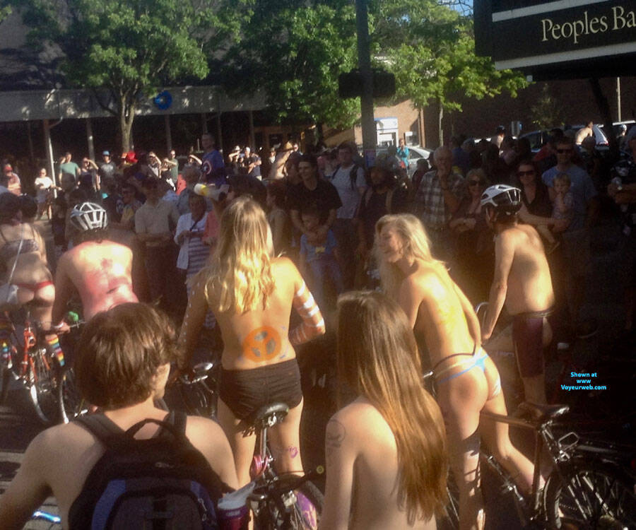 There were about 300 bike riders that showed up to participate, but it is a clothing optional event, so not everyone was totally naked, and a lot of people were not that attractive, so it just didn't feel sexualized. Once the bike ride starts you're mind is busy maintaining speed and distance with other riders. It seems like the whole town is aware of this happening because the streets are packed with spectators lined up on the sidewalk, block after block, who have stopped to come out on the street to see if anyone is daring enough to be nude in public! The reaction from people is overwhelmingly positive, and you feel like a rock star, like you suddenly have a magical power to go anywhere you want, and it's a huge boost to your self-confidence.